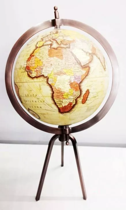 Questo globo in airon/alluminio è una mappa sferica, o modello in scala della Terra. Su un globo, le proporzioni in dimensioni, forma e distanza tra paesi e continenti sono corrette, cosa che non è possibile con una mappa piatta.