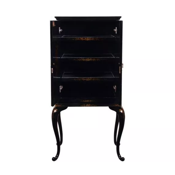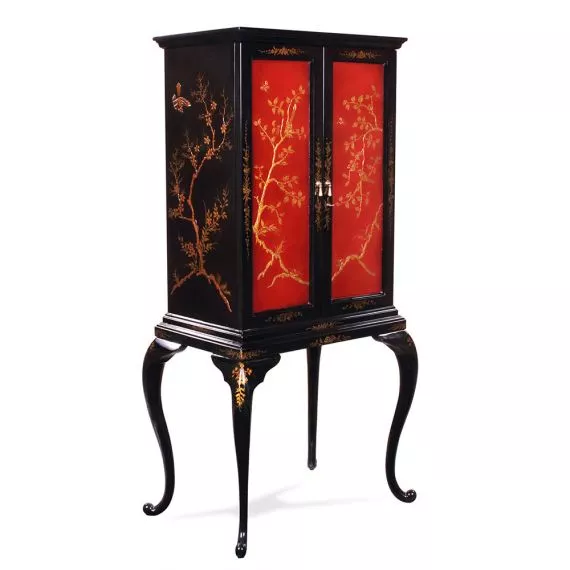 Mobilio per gioielli Chinoiserie. Piccolo mobile per gioielli in stile chinoiserie. Fatto di mogano. All'interno ci sono 3 mensole di legno con fondo di velluto che si possono tirare fuori.