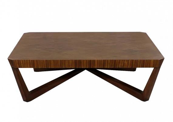 Tavolino 'Festivo'. Festivo è un tavolino da caffetto moderno e contemporaneo con una caratteristica firma sulle gambe. La parte superiore è coperta da un motivo unico di impiallacciatura e bordi a bordo.