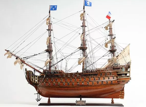 Intorno allo scafo si possono vedere cannoni in ottone, binari e accessori in ottone, una grande figura di prua in ottone, bellissime opere d'arte intorno alla poppa. Sul terrazzo, ci sono scale collegate a diversi piani; un grande gommone di legno che ha le sue palette, un pannello per il lucernario, il timone della nave, la campana della nave... Ecc. I dettagli sono semplicemente straordinari. Ci vogliono centinaia d'ore per costruire lo scafo e le sartie. Il modello è dotato delle sue bandiere francesi originali e poggia su una base di legno stabile con una targhetta metallica con il nome attaccato.